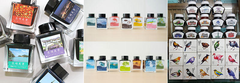 (写真左から)石丸文行堂(長崎県)「長崎美景」シリーズ、うさぎや(岡山県)オリジナルインク、鋼筆工作室(台湾)「建築墨水、鳥墨水」シリーズ