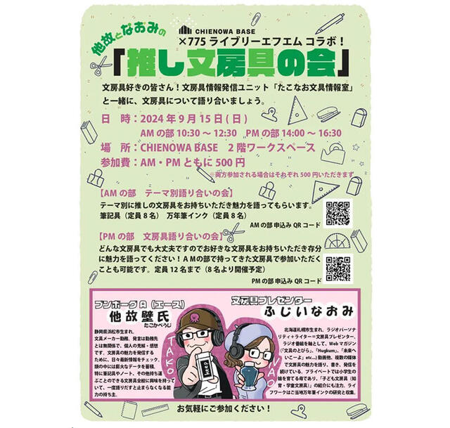 好評放送中のラジオ番組「他故となおみのブンボーグ大作戦!」のパーソナリティを務めている“たこなお文具情報室”の他故壁氏さんとふじいなおみさんのお二人と一緒に、文房具について語り合う第2回「他故となおみの 推し文房具の会」が2024年09月15日に埼玉・朝霞市のCHIENOWA BASE(2階会議室)で開催される。参加費は税込500円(午前と午後両方参加の場合は同1,000円)。