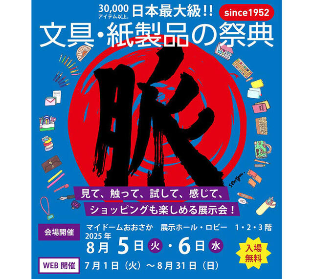 文紙MESSE協議会(一般社団法人大阪文具工業連盟、大阪紙製品工業会、中部文具工業協同組合)主催の恒例の文具イベント「文紙MESSE2025」(協賛:大阪文紙事務器卸協同組合、大阪文具事務用品協同組合、一般財団法人大阪文紙会館)が2025年8月5日、6日の両日、大阪市のマイドームおおさかで開催される。また、7月1日から8月31日の2カ月間にわたりWebでも開催。