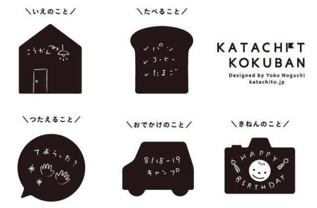 “きりぬき”の黒板のかたちは、「いえ」「パン」「ふきだし」「くるま」「カメラ」の5種類で、単品とセットがあり、セットにはチョークホルダーと極小の黒板拭き、チョークホルダーのスタンド(マグネット付き)が付いている。価格は単品が税抜700円、セットは税抜1500円。