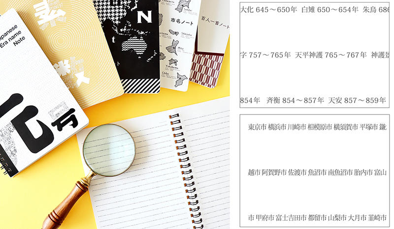 昨年6月に、キングジムがボツネタとしてツイッターに投稿した、“罫線が円周率で表記されているノート”をロフトが商品化した「円周率ノート」が大ヒット。今回は、その第2弾として発売するもので、「雑学罫線ノート」としてシリーズ化。「元号」(大化から平成まで記載=下写真右=)、「百人一首」(100人の歌人の和歌を全て記載)、「素数」(2~5107までの素数を記載)「国名」(193の国名を記載/2017年5月現在の国際連合加盟国193か国対象、通称・略称で表示)、「市名」(北海道から沖縄まで、日本の市名が全て記載=下写真右=/2017年10月現在、全国地方公共団体コード順)の5種類をラインアップしており、表紙色は各2パターンの全10種類。