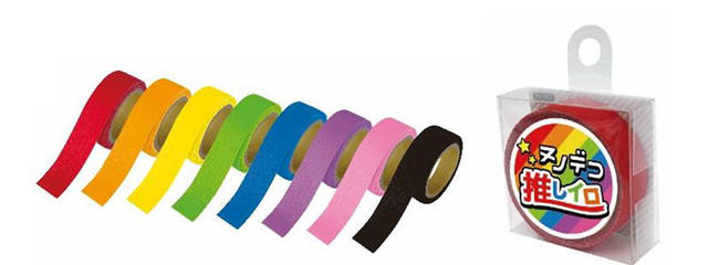 KAWAGUCHIは、アイロンでしっかり接着できる、布でできた布に貼れるテープに、アーティストやキャラクターのイメージカラーによく使われる8色(下写真参照)をラインアップした「NUNODECO TAPE推しイロ(ヌノデコテープオシイロ)」を、2018年3月20日から発売した。幅15mm×長さ1.2mで、税抜380 円。