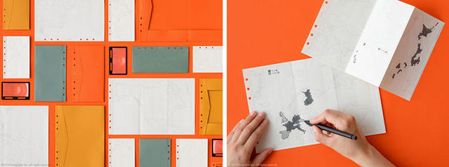 「ワールドマップ(世界白地図)」(上写真右)は、活版印刷の凹凸感で地図の立体感を表現した白地図リフィル。アジア 北・東・南・日本地図、東南アジア・オセアニア、アフリカ・中東、ヨーロッパ、北アメリカ、南アメリカの6エリアがそれぞれ1枚ずつセットになっている。A5サイズは2つ折、バイブルサイズ、ナローサイズ、ミニサイズは3つ折にして広げて使える。用紙には、活版印刷に相性の良い紙を採用。淡いクリーム色と空気感がある柔らかな風合いが白地図を引き立てる。地図色はクールグレーを使用し、ワンポイントで方位記号にブランドカラーのオレンジをあしらった。