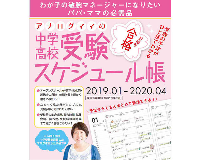 アナログママは、「2019年受験版 中学・高校受験スケジュール帳」を2018年10月から発売する。 価格は税抜で1,777円(ラッキーセブン)、税込で1,919円(行くぞ行くぞ!)。