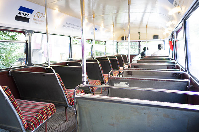 プレスイベントの当日、待ち合わせ場所でバスの到着を持ちわびていると、やがて青・白・黒の“モノカラー”を車体に施したバスが姿を現した。早速車内に乗り込むと、1F 席にはなんと「モノ消しゴム」たちが座っているではないか。