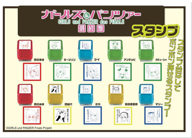 谷川商事は、「ガールズ&パンツァー」のキャラクターをデザインした「スタンプ」(全10種、各税抜500円)と、「スタンペンGノック式スタンプ」(全10種、各税抜1,500円)を発売する。