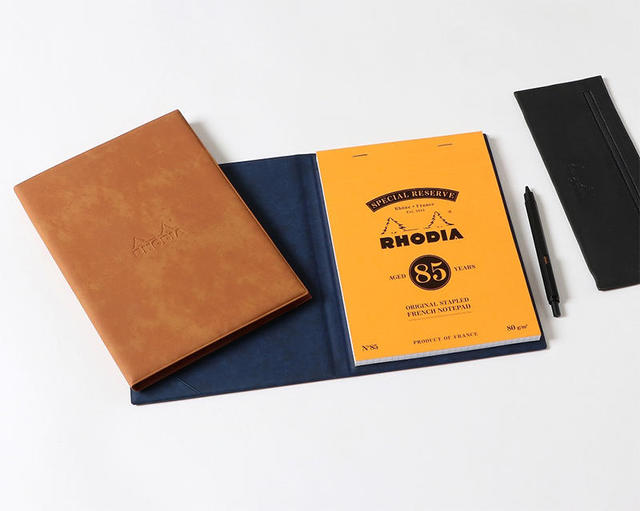 また、ハードカバー「ブロックロディアNo.16 85 周年限定デザインハードカバー」は、耐久性、撥水性に優れた発泡PVC製カバー。内側の三角ポケットは収納やジョッターとして使用できる。ブラック、ネイビー、キャメルの3色のラインアップ。サイズはA5サイズで、85周年記念限定デザインのブロックメモ1冊を付属。価格は税抜2800円。