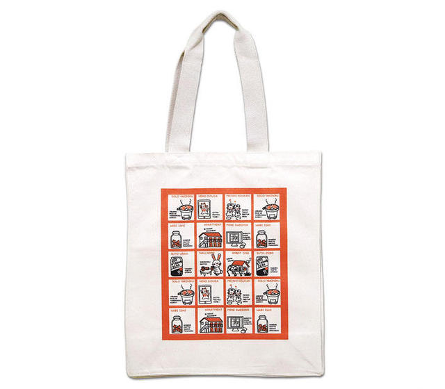 昭和の懐かしいファンシー紙袋をパチモノ風にリデザインしたトートバッグ。平成・令和の大人が大好きなものばかりを集めてかわいく配置した。微妙な版ズレなども当時風に再現してあるという。B4サイズのファイルなども入る大きめサイズ&分厚いキャンバス地で、買い物バッグから勉強道具の持ち運びまで便利に使える。