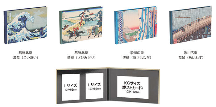 最高品質の台紙を使用した「ブック式フリー台紙アルバム」は、片面にL判(ヨコ89×タテ127㎜)タテ2枚またはKG判(ヨコ152×タテ102㎜)ヨコ1枚の写真やポストカードを貼れ、フリー台紙タイプで自由なレイアウトでアルバム編集を楽しめる。ラインアップは、葛飾北斎の2柄(濃藍・錆緑)、歌川広重の2柄(浅縹・藍鼠)の計4種。税抜1,500円。