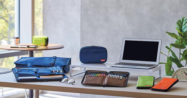 このほか、既存品の「ペンケース[ブックタイプ]」、「ペンケース[ブックタイプ]ダブル」、「バッグ イン バッグ」(A5、A4)、「キャリングバッグ[2ウェイタイプ]」に人気の藍色を追加する。