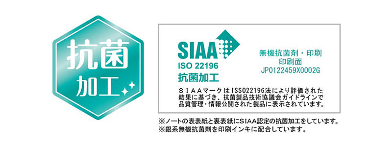 オモテ表紙とウラ表紙に抗菌加工を施したノート。SIAA(抗菌製品技術協議会)認定の銀系無機抗菌剤を施しているため、ノートを清潔に使用することができる。ノート提出のときや複数人とノートを共有するときなども安心。