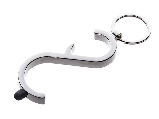 外出時の感染症対策に、ボタンやドアを触れずに操作するドアオープナー。電車やバスのつり革やドアノブなどに引っ掛けたり、エレベーターのボタンを押したりするときに使える。