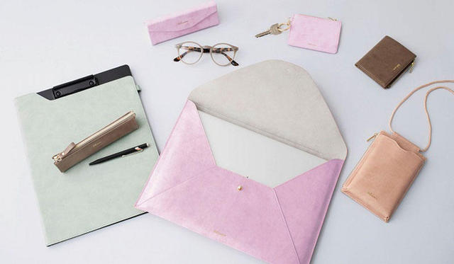新色を追加したアイテムは、「IDホルダー」(税抜2,000円)、「マルチポーチ」(同2,000円)、「クリップファイル・A4」(同3,800円)、「折り畳み式メガネケース」(同2,000円)、「ペンケース」(同1,400円)、「パスケース」(同2,200円)、「名刺ケース」(同2,200円)。