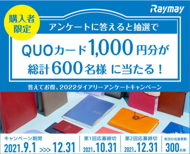 レイメイ藤井は、同社の2022年版ダイアリーを購入しアンケートに答えると抽選で合計600人にQUOカード1,000円分が当たるキャンペーン「2022レイメイ藤井ダイアリーアンケートキャンペーン」を実施。キャンペーン期間は2021年9月1日から2021年12月31日まで。