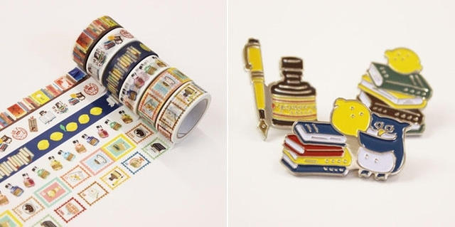マスキングテープ(幅15㎜×7m巻)は、「本棚」「本とふくろう」「アテナインキ」「檸檬」「文房具」「BOOK Cafe」の6柄をラインアップ。税込330円。ピンバッジ(真鍮製)は、「本とふくろう」「アテナインキ」「本と檸檬」の3種をラインアップ。税込770円。