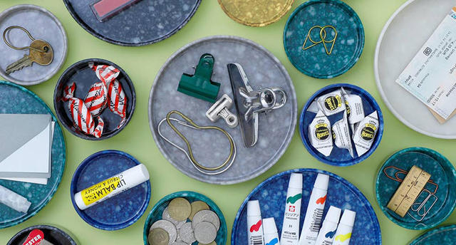 サイズ感が絶妙なサークルデスクトレイは、メイク道具やアクセサリー置きに。玄関先でカギやコインを置いたりしてもOK。さまざまな色やサイズを組み合わせて楽しめる。