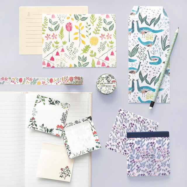 メモパッド、ふせん、レターセット、ポチ袋、マスキングテープのラインアップで、同社によると特におすすめのアイテムはメモパッドとふせん。メモパッドは紙の裏面にイラストが印刷してあり、表からの透け感が楽しめる。また、ふせんは4柄のデザインが楽しめるお得なセットになっている。