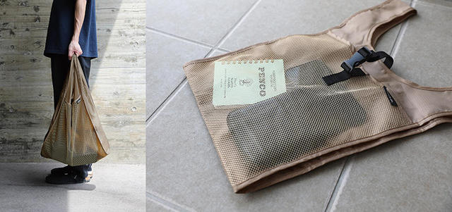 「ショッパー/ショッパー S」は、前面には財布やスマホなどの手回り品を収納できるメッシュポケット、バッグの口を留めたり折りたたむためのバックル付き。しっかりとしたマチを備え、大きめサイズは食材の買い出しに、Sサイズはコンビニなどでの少量のお買い物に適している。シンプルなデザインながら機能性も兼ね備えた、日々のお買い物やサブバッグとして活躍するアイテム。
