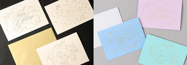 カードには流麗なモダンカリグラフィーに繊細なイラストがあしらわれたデザインを箔押ししており、光沢が美しく高級感のあるパール紙の封筒をセット。お礼やお祝いのメッセージを華やかに演出する。全6種類をラインアップ。
