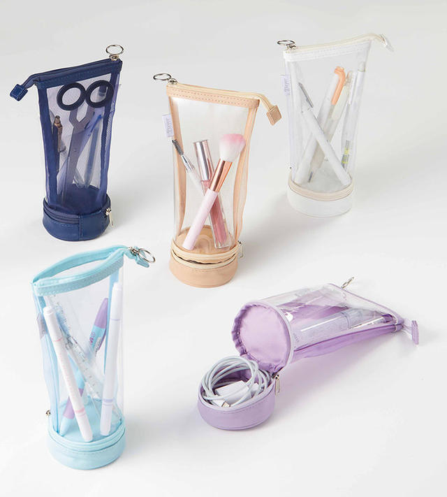 カラーはブルー、ベージュ、ネイビー、バイオレット、ホワイトの全5色。筆記具やハサミ、付箋などの文具の他に、メッシュで通気性もあるので、メイク用品なども収納することもできる。