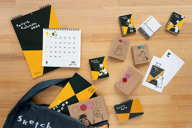 缶の中に、缶にデザインされたスケッチブックと同じ紙のメモ用紙が入ったメモ「缶入りメモ 図案スケッチブック柄」・「缶入りメモ クロッキーブック柄」や、毎月の挿絵を描いてオリジナルのカレンダーが作れる「2024年1月始まり 図案お絵描きカレンダー」、マルマンの代表的なスケッチブックを持った浅野みどりさんの動物イラスト全10柄のポストカード「画用紙ポストカードセット」など、魅力的な限定グッズがそろっている。