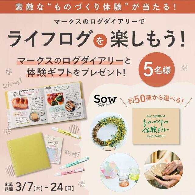 マークスは、素敵な体験を贈ることができる体験ギフト「ソウ・エクスペリエンス」とのコラボキャンペーンとして、「マークスのログダイアリーでライフログを楽しもう!素敵な体験ギフトプレゼントキャンペーン」を、マークスのInstagram・Xの公式アカウントにおいて、2024年3月7日(木)~2024年3月24日(日)の期間に開催する。