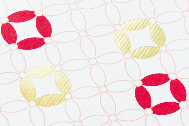 鮮やかな色で表現した伝統紋様に箔押し加工を施し華やかな雰囲気に仕上げた。箔の輝きが特別感を演出しており、日常のやりとりから特別な場面まで、幅広いシーンで使用することができる。