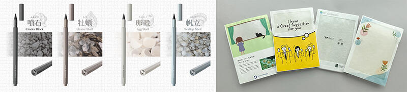 「リ:メタシル」(左)、「紙エール(透明加工)紙ファイル(リサイクル可能)」(右)