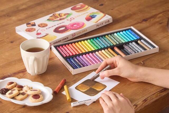 クレパス50色で描いたイラストと商品の写真を「#クレパス50色で描きました」をつけて投稿