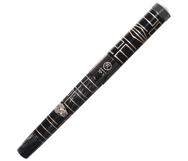 銀粉で蒔かれた「巳」のボディには、螺鈿の繊細なきらめきでうろこを表現した白蛇の姿が立体的な高蒔絵で描かれており、またキャップにも1カ所、幾何学的なデザインの蛇の姿が描かれている。18Kのペン先には、「手書きという方法で日常に一拍おく時間を設けることで、身近にある美しいものや人との繋がりを再発見していただきたい」というROMEOの新コンセプトに基づき、音楽の「四分休符」をデザイン。また、ROMEO No.3シリーズのアイコニックなデザインパーツである、時計の竜頭をモチーフにした天冠には「大切な時間をこの筆記具と共に過ごしてほしい」というメッセージが込められており、精緻な彫刻が施されたステンレス製のロゴバッジが、さりげない上質感を添えている。