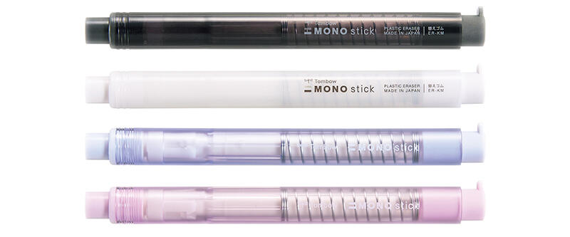 「モノスティック」は、ブロック形の「モノ消しゴム」と字消し能力や使用感が同じホルダー消しゴム。マークシート試験などにも使用できる。ホルダーは、直径12.5ミリ・長さ130ミリのペンタイプ。筆記感覚で消せて、携帯に便利。 ワンノックで約1.5ミリの消しゴムを繰り出す(消しゴムは長さ100ミリで、ホルダーで使用できる実効長は約77ミリ)。定番色は学習に集中できる無彩色のブラックとホワイト。 限定色は淡いミュートカラー。マットな仕上げが魅力。