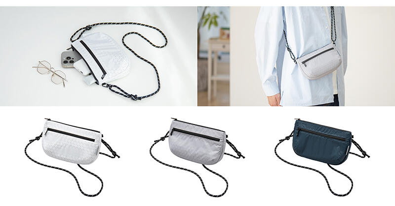 「軽量スマホポーチ」は、本体内部にメッシュポケットが付いており、スマホと小物をまとめて持ち運べる。ショルダーベルトとカラビナ付きで、2WAYの持ち方が可能。税込2,640円。