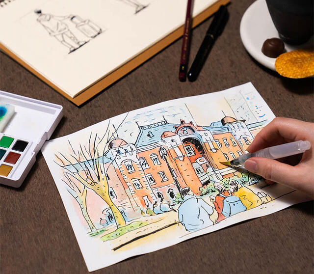 新レッスンでは、水彩スケッチで街の風景を描きたい人に向けて、道具の使い方から描き方のコツまで、順を追って動画で紹介する。線の描き方、人や木の描き方、水彩絵の具の使い方など、初心者に向けて丁寧に解説をしていく。レッスンの最後では、アーバンスケッチの代表格「東京駅」の絵を完成させます。構図のとり方や簡単な着彩方法など、ポイントを紹介。