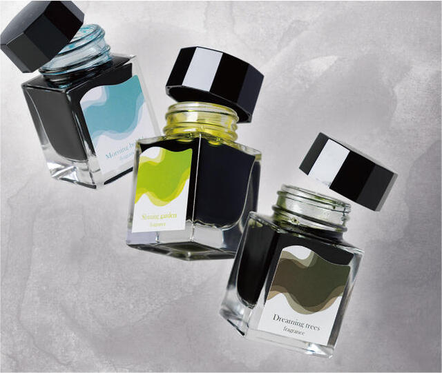 「万年筆ペン先のつけペン hocoro」シリーズの第5弾として、蓋を開けると香りが広がるフレグランスインクが登場。ボトルやペン先から香りが漂い、視覚(インク色)でも嗅覚(香り)でも楽しめるフレグランスインクが、書く人の日常を豊かに彩る。ラインアップは、「モーニングバブル/フレグランス」、「シャイニングガーデン/フレグランス」、「ドリーミングツリー/フレグランス」の3種。