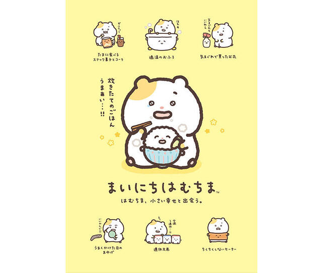 韓国をはじめとするアジアで人気のハムスター。ハムスターらしいかわいさが「まいにちはむちま」の魅力の一つとして、「サンエックスのコ企画」のテスト販売でも人気となっていた。第1弾では、がんばってきた大人ならだれでも共感できるような「小さい幸せと出会う」をテーマにアイテムを展開している。