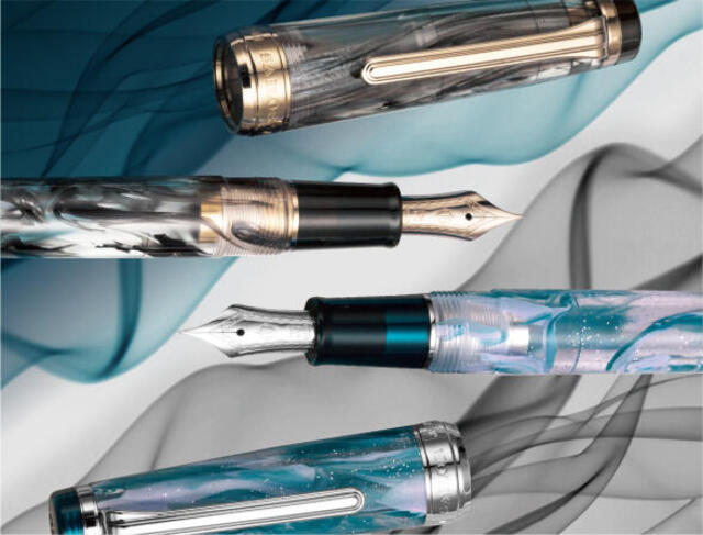 「VEILIO」は、透明ベースの国産アクリル切削材を使用し、マーブル柄を万年筆の“顔”であるペン先を覆うベールに見立て、ベール(veil)と色(iro)を組み合わせたシリーズ。第4弾では、パールブラックとブルーパープルの2色が登場。シリーズ初の仕様として、ブルーパープルにはラメを採用した。