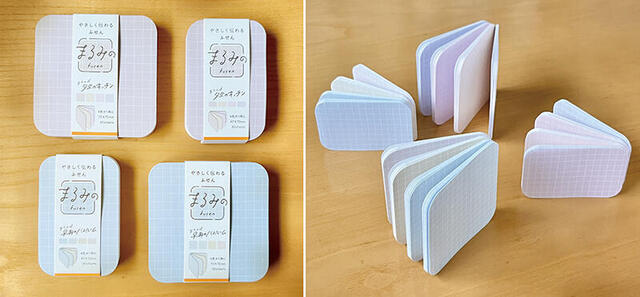 シリーズの特徴である角の丸みがかわいいふせん「まるみのgrid」は、整理して書きやすい白色5㎜方眼罫で、書いた文字が見やすいパステルカラー。4色が1冊になっていて、コンパクトに持ち運べる。