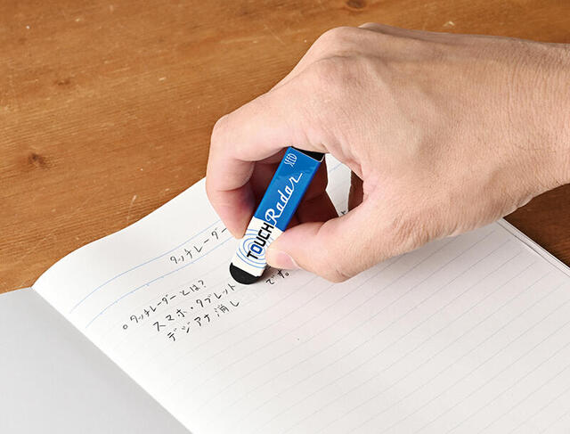 「タッチレーダー」は、通常の消しゴムとして使用できるほか、スマホ・タブレットを操作できるのが特徴。消しゴムの先をスマホ・タブレット画面に設置することで、スムーズな画面操作が行える。これによって、指が画面に触れず、画面を汚す心配がなくなる。なお、画面操作において、「タッチレーダー」では文字入力を行うことはできない。