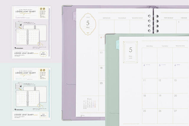 やわらかで落ち着いた色合いのバインダー「ユアンス」と「ルーズリーフダイアリーエレガント」のセットが4月始まり版で新登場。「ユアンスダイアリー」は、ダイアリー以外に3㎜方眼罫ルーズリーフ、くすみカラールーズリーフミニ、サイドインクリアポケットがセットされている。ライトパープルとミントの2色をラインアップ。A5サイズで、税込2,090円。