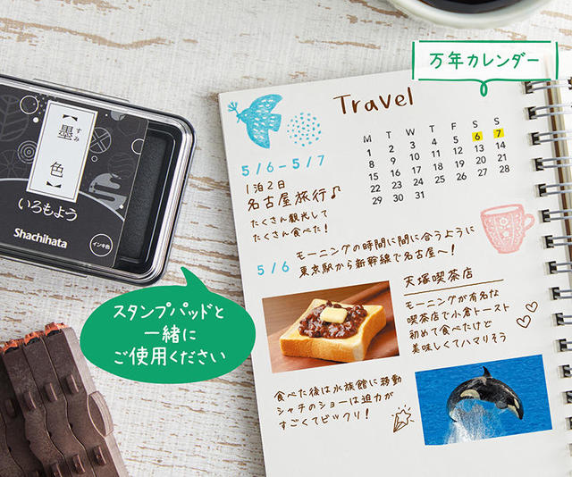 今回追加するのは、デコレーションの中でもしっかりと日付を表示できる大きな数字の「月日」と、連結する本数によって好きなサイズ・形に変えられるイラスト枠・罫線の「フレーム」。昨今の「手帳デコ」、「ノートデコ」、「コラージュ」の盛り上がりに合わせ、「いろもよう」シリーズのスタンプパッドと組み合わせて楽しめるゴム印として展開する。