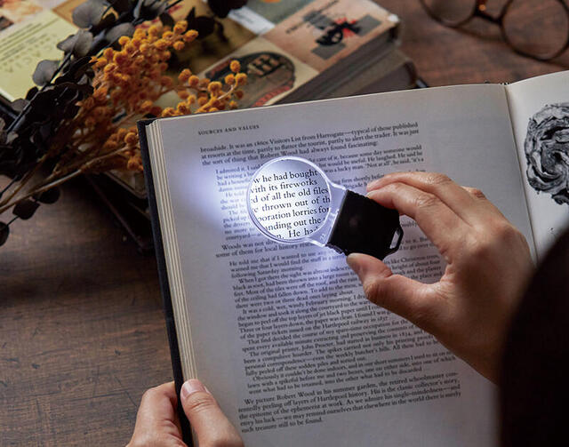 「電球ルーペ」は、電球をモチーフにしたユニークなフォルムで、LEDライト付き薄型ルーペ。手のひらサイズでコンパクトながら、直径45㎜のアクリルレンズを採用。新聞や辞書、商品の成分表、注意書きなど、日常生活で目にする細かな文字を快適に読むための補助ツールとして最適。レンズは用途に応じて選べる2倍と3倍の2種類をラインアップ。使用シーンに合わせて好みの倍率を選べる。