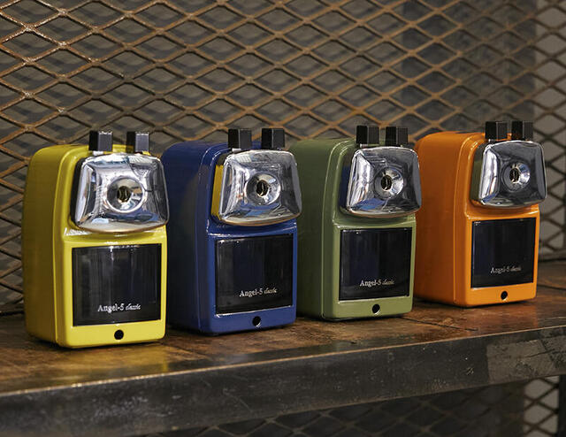 「エンゼル5」は、1960年に発売した「 A-5 エンゼル鉛筆削器」を2010年に復刻したモデル。どこか懐かしいレトロ感と、スチールの重厚さ、国産削り刃の切れ味が評価され人気となり、2011年日本文具大賞優秀賞を受賞した。