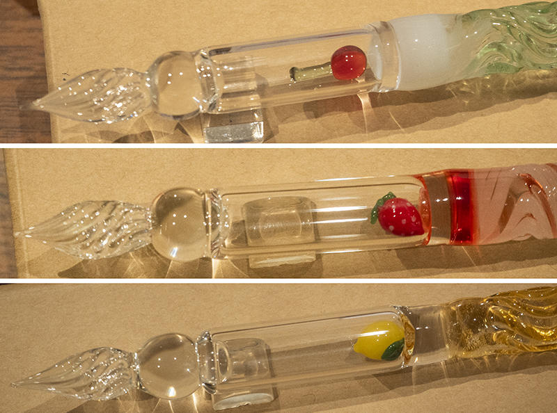 ペン軸の中に、それぞれの飲み物にちなんだガラス製のマスコットを入れているのが大きな特徴。使う度に軸の中で動くので、その様子がとてもかわいい。マスコットは手作りなので、一つとして同じかたちがないそうだ。