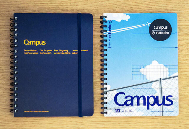 筆者が購入したのは、ロルバーン風のキャンパスノートです。手持ちのロルバーンと並べてみましたが、本来なら“Rollbahn”のロゴが入るところに“Campus”のロゴが配置されています。あと、左下に小さく“Campus 50th×Rollbahn 25th Anniversary”と書かれていますが、それ以外はロルバーンと同じデザインです。これが、デルフォニックスじゃなくてコクヨから発売されているのが、不思議といえば不思議です。